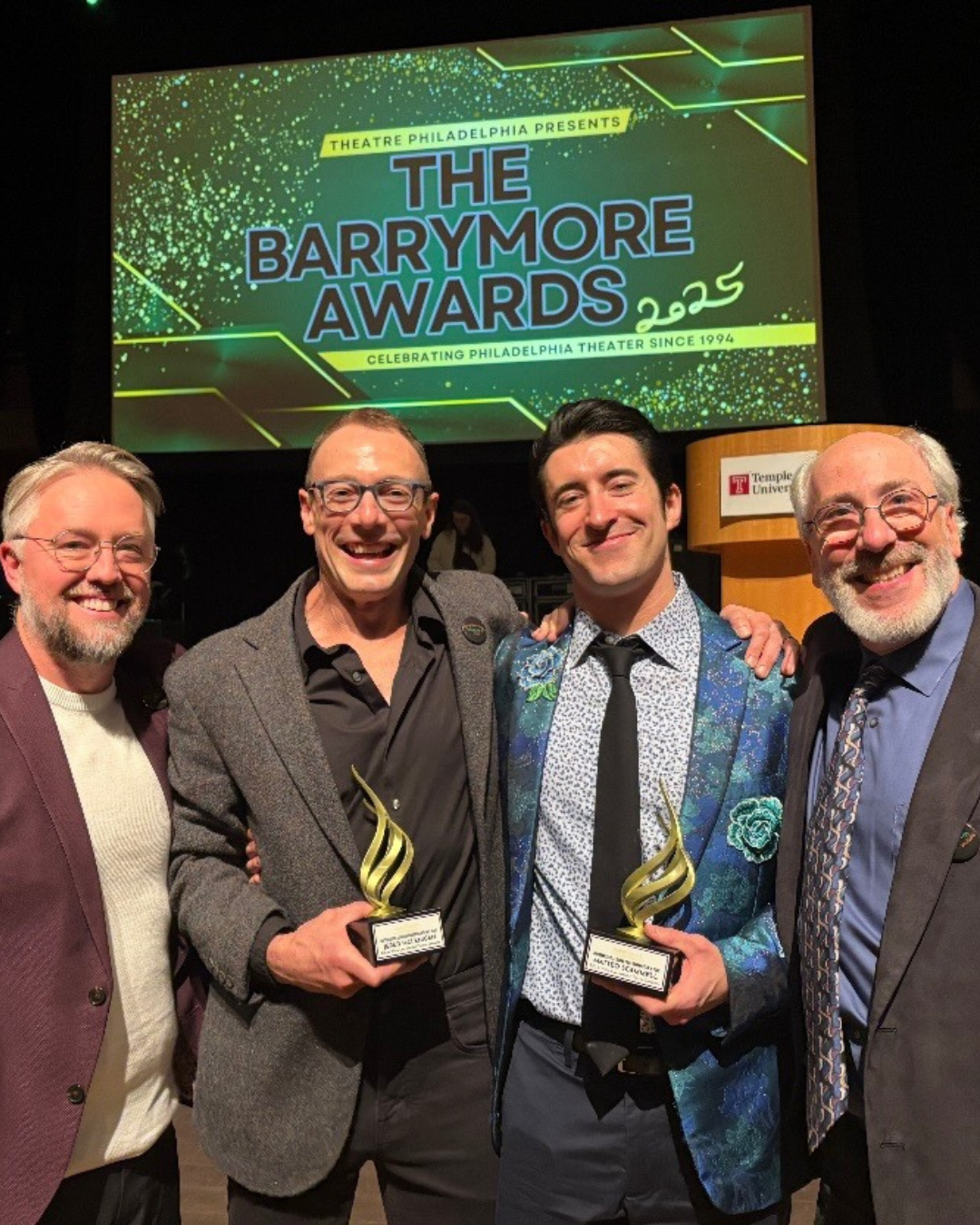 Jered McLenigan and Matteo Scammell are now 2025 Barrymore winners in the category of Most Outstanding Leading Performance in a Play for InterAct’s production of RIFT, OR WHITE LIES. (Pictured with Playwright Gabriel Jason Dean and Director Seth Rozin.)